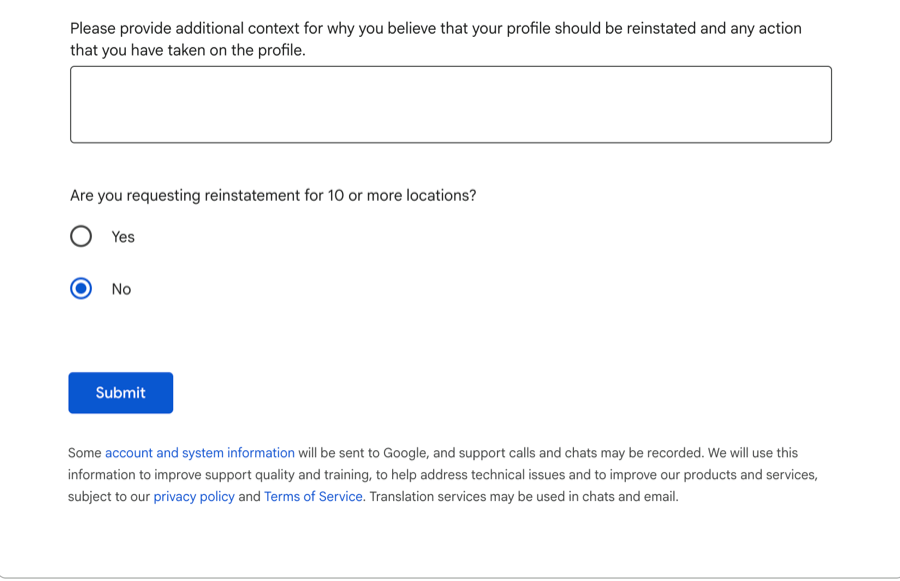 Access the Google Business Profile appeals tool through your suspension email, your dashboard notification, or directly through the Google Business Profile support page. For a full walkthrough of submitting a Google Business Profile reinstatement request, see our dedicated guide.