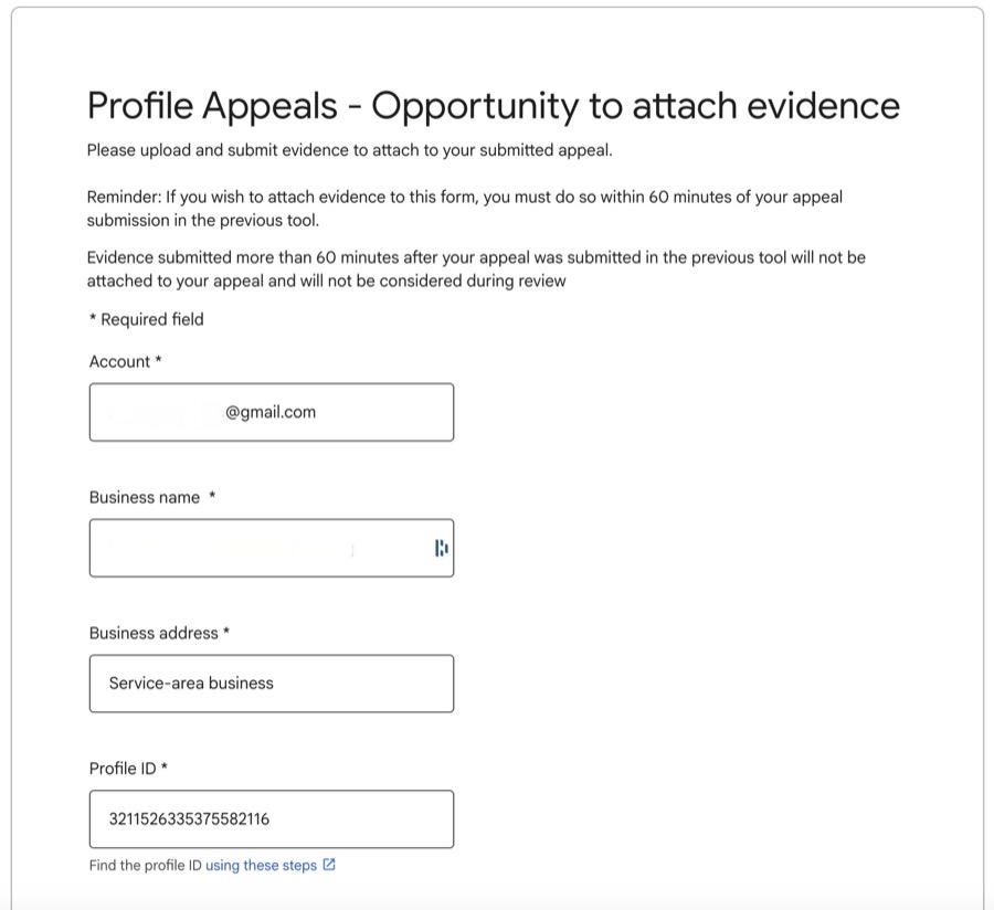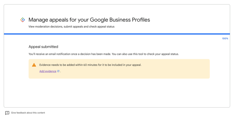 The moment you click “Submit Appeal” in the Google Business Profile appeals tool, a timer starts. You have exactly 60 minutes to click “Add Evidence” and upload your documents. After that, the window closes and your appeal proceeds without documentation, which sharply reduces approval chances.